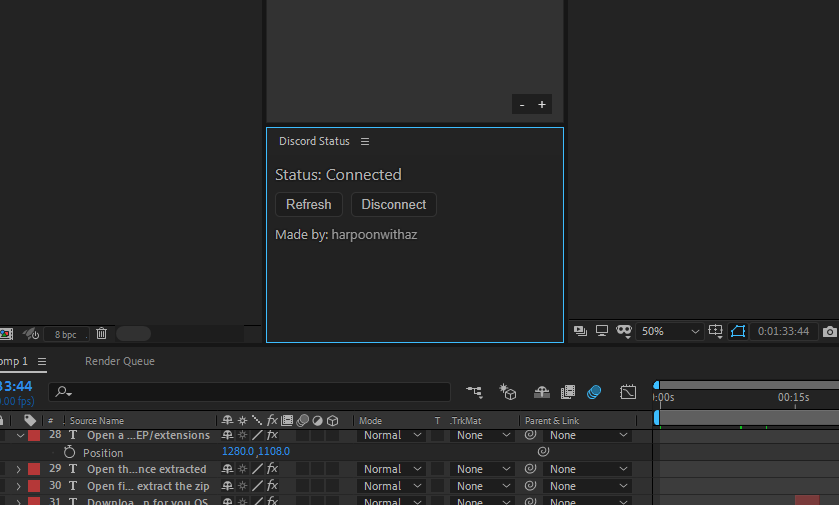Extension for Adobe After Effects that displays real-time editing status to your Discord profile. Utilizes GitHub Actions to automate the build process and streamline versioned releases for Windows and macOS.