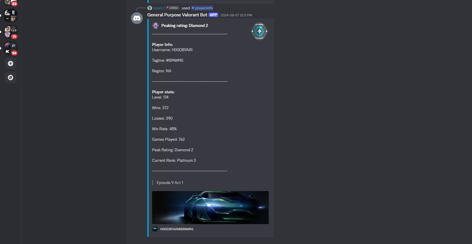 Discord bot that provides commands for Valorant players to check their stats and match history. Uses the unofficial Valorant API by Henrik 3 to retrieve data and the valorant-api by NotOfficer for in game assets.